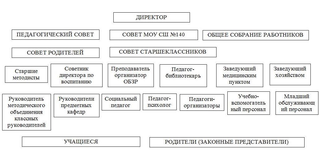 Единоличным исполнительным органом МОУ СШ №140 является директор, который осуществляет текущее руководство деятельностью МОУ СШ №140.В школе формируются коллегиальные органы управления: Совет МОУ СШ №140, Общее собрание работников Школы, Педагогический совет. Структура, порядок формирования, срок полномочий и компетенция коллегиальных органов управления МОУ СШ №140, порядок принятия ими решений и выступления от имени МОУ СШ №140 устанавливаются Уставом МОУ СШ №140 .